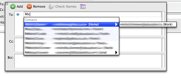 In my Contacts some entries have multiple e-mail addresses (e.g home & work); however when I wish to compose a new e-mail, Entourage only shows one address (presumably the default). When I was using Outlook I was always able to select whichever 'address' I needed; surely this can be done in Entourage?